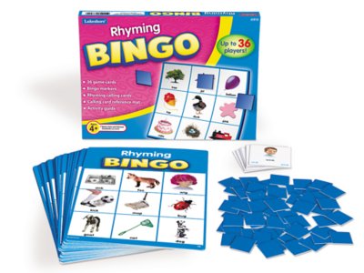 This easy-to-play bingo game gives children a super-fun way to explore rhyming sounds! It’s played just like traditional bingo, only when you call out a word, kids search their photo-illustrated game cards for the word that rhymes! Game includes all the materials you need for up to 36 players.