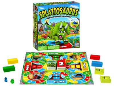 In this action-packed game, children sculpt their own dinsoaurs…then race them through the prehistoric jungle to get the dinsoaurs home! But they better be careful—or their opponents will SPLAT their dinosaurs into extinction! You get a game board, a dinosaur mold, 4 blocks of modeling clay in 4 colors and a deck of game cards. Game board measures 16" x 16". For 2-4 players.