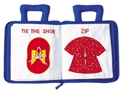 With flaps to lift, shapes to match, laces to tie and so much more, our soft-sewn book is bursting with surprises! Just unzip the book to reveal 8 interactive pages with simple text and colorful illustrations that help kids explore time, shapes and more! Plus, the book is machine-washable—and features handles for easy toting! Book measures 8 1/2" x 12".