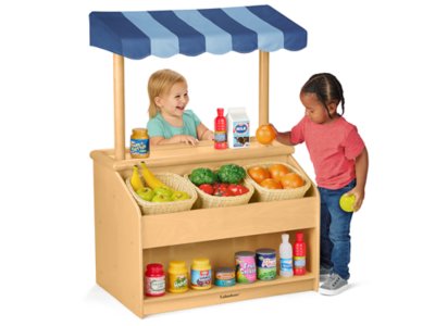 Our charming market is made for little shopkeepers with big imaginations! There’s ample shelving on both sides for storage, including an angled display shelf in front that’s perfect with or without our baskets (sold separately). And the hardwood unit has toddler-safe rounded corners, plus a roomy, self-contained countertop with easy-grip handrails so tots can pull themselves up and stand. There’s even a fabric awning—just like you’d see at a real farmers’ market! Assembly required. Accessories not included.