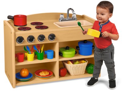 Inspire imaginative play with a kitchen designed just for your littlest learners! Our super-safe, rugged kitchen features smooth, rounded corners and tons of authentic details—from a removable, easy-clean sink with a stainless steel faucet to real-turning knobs and faux burners on the stove. The wipe-clean laminate unit even has 4 roomy shelves on bottom for storing play pots, pans and more—so children can serve up tons of fun! Play dishes and food sold separately.