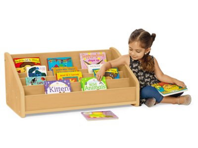 Our super-sturdy bookstand has storage for tons of board books…and a low-to-the-ground design that discourages little ones from climbing! Made of durable laminate, the rugged, no-tip stand features 4 open shelves and sturdy side panels with smooth edges and safe, rounded corners. Plus, the open design makes it easy for tots to help themselves to books!