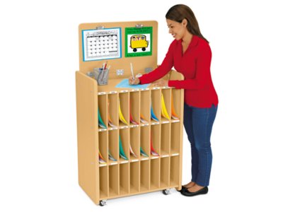 Great for sign-ins, parent communication and more, our mobile center gives everyone access to information! It features 24 cubbies to send home artwork, schedules and more—all with labels for easy identification. Plus, the desktop puts sign-in supplies right within reach, and 2 clips make it easy to display information. With locking casters and rounded corners for safety.