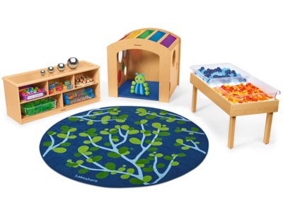 Children experience the joy of discovery as they develop their focus, regulate emotions and more! From a multitextured hedgehog and a plush, fun-to-hug bug to a light table and translucent manipulatives—here’s everything you need to safely engage children’s senses and promote visual, auditory and tactile exploration. There’s even a cozy hideaway where children can sit and relax while making discoveries about light, texture and color. The Just Like Home® Branches Carpet measures 6' round.