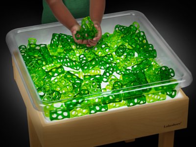 Little ones can’t wait to get their hands on our super-safe, easy-grip cylinders—designed to illuminate on light tables! Perfect for touching, scooping and exploring, these translucent cylinders take sensory play to a fun new level. Plus, they’re toddler-safe and fully washable! You get 145 plastic cylinders in 2 shades of green; each measures 2 1/2". Light table and tray sold separately.