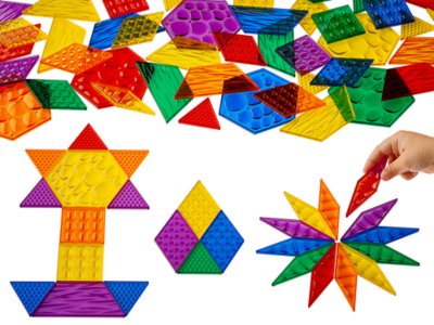Use these textured, see-through pattern blocks on any light table—for hands-on sensory fun that really shines! Great for exploring early math, developing fine motor skills and more, the 70 durable plastic pieces come in 6 shapes and colors and include a storage jar. Hexagons measure approximately 4".