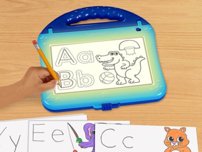 Shine a light on alphabet skills! Kids use our light-up center to trace letters and cute corresponding images. Simply slide a tracing card in place, set paper on top…then trace the illuminated letters and images. Along the way, children practice printing skills, boost letter recognition and explore letter sounds! The center has a built-in handle and comes complete with 20 sheets of paper, 13 tracing cards covering all 26 letters, plus a pencil. Center measures 9 1/2" x 10 3/8". Requires 3 “AA” batteries (not included).