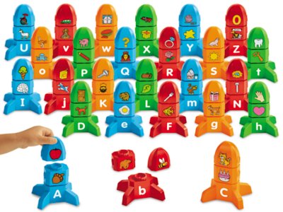 Alphabet skills are ready for liftoff—with hands-on rockets that make language practice a blast! Each double-sided rocket features 3 easy-fitting pieces that show the upper- and lowercase letter, plus 4 pictures that represent the letter sound. Kids just match up the pieces to build each rocket—boosting letter recognition and exploring letter sounds as they play! You get 26 durable plastic rockets (for a total of 78 pieces); rockets measure 5" tall.