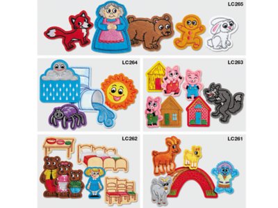 Kids can enjoy 5 more delightful stories with our second set of puppets! Just stick them onto a brushed nylon surface to act out each story again and again. You get all 5 sets shown. Largest piece measures 5". Each set also available separately.