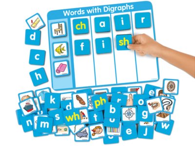 Students learn to identify digraphs as they practice building dozens of words—sound by sound! Our magnetic board comes with everything children need to build 36 different words, including picture magnets with familiar, everyday images, plus phonics magnets with the targeted sounds highlighted. Students just stick picture tiles onto the left column of the board, then build the corresponding words by sounding each one out—exploring spelling patterns and building language skills as they go! Set includes an 8" x 10 1/2" board, 36 picture magnets, 36 letter magnets and an activity guide.