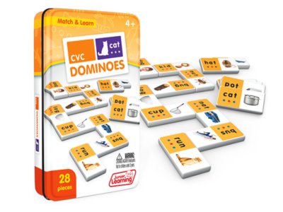 Looking to help kids master CVC words? These colorful dominoes are a fun way to do it! Great for helping children learn through play, the easy-to-grasp and easy-to-read dominoes feature a CVC word with a dot for each phoneme on one end plus the corresponding photographic image on the other. Students just match the word to the correct image—for tons of essential CVC practice! You get 28 plastic dominoes in a storage tin with a lid. Dominoes measure 1 9/10" x 1" x 1/4".