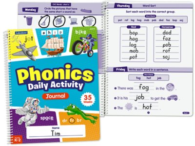 Our activity-filled journal builds phonics skills day by day—for all 35 weeks of the school year! Each week, students explore a new phonics concept—from CVC words and vowel teams to blends and digraphs—and independently complete a different daily activity that allows them to focus on and master the targeted skill. Spiral-bound journal measures 8" x 10 1/2" and is 76 pages long.