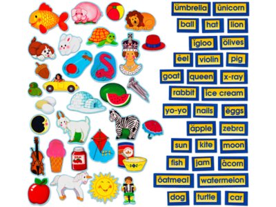 These ready-to-use felt cutouts stick to any felt board or soft, brushed cloth surface—without glue or adhesives! They’re easy to move and reuse again and again, encouraging interactive learning. The kit includes 62 pieces—31 picture pieces (one for each consonant, plus long and short vowel sounds) and 31 corresponding word pieces. Largest piece measures 8" in length.
