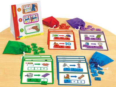 Kids build phonics and spelling skills—with a ready-to-use activity center they can explore on their own! Our instant center is specially designed for independent exploration: Just set out the materials, introduce the activity…then students use illustrated activity mats and hands-on tiles to spell out simple words…then switch a sound to create brand-new ones! The center has enough materials for up to 4 children to work at once, including a double-sided instruction chart that gives everyone easy access to the activities…and simple picture instructions, so even nonreaders can participate. Center includes 16 mats, 54 tiles, plus a write & wipe assessment card.
