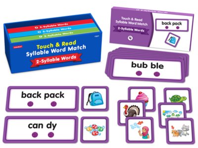Our fun-to-use match-ups help students read multisyllabic words—as they pronounce one syllable at a time! Children simply choose a card featuring a segmented two-syllable word...touch the textured dot under each syllable to decode and read the word...then find the picture card that matches! Set includes 40 textured word cards, 40 picture cards, 4 storage pockets and 4 answer cards. Pockets measure 3" x 6 3/4".