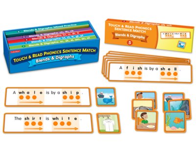 Students build phonics skills and master words with blends and digraphs in a hands-on, tactile way—within the context of simple sentences! The sentence cards have a textured dot for each phoneme in the focus words, plus arrows to help kids blend the sounds together. Kids read a sentence, then find the corresponding picture card to make a match! You get 48 textured sentence cards, 48 picture cards, 6 storage pockets and 6 answer cards. Pockets measure 3" x 10 1/4".