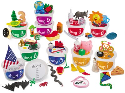Our hands-on teaching tubs provide the extra reinforcement kids need to understand vowel sounds—and develop word recognition and decoding skills, too! Each tub is filled with miniature objects whose names contain one of 10 major vowel sounds…with separate tubs for long and short vowels so children can focus on one sound at a time. Children practice vowel sounds as they explore the objects, sort them into the proper tubs…or even match them to the words on the lids! You get 10 tubs, 60 miniatures and an activity guide.