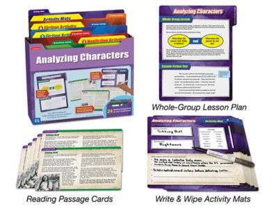 With our super-involving, hands-on kit, students don’t simply practice analyzing characters—they learn to use text evidence to support their thinking! Perfect for independent, small-group or whole-class use, our versatile kit comes with everything students need, including a whole-group lesson card with sample texts that help teachers explain analyzing characters, plus 6 sets of materials in each of the 4 different activity folders. Kids just follow the 3-step instructions…write their answers directly onto a write & wipe activity mat, citing textual evidence as they go…and check their work against the answers on the back of the folder! Folders measure 9 1/4" x 11 5/8". Write & wipe markers sold separately.