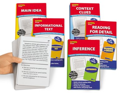 Help students become better readers—one skill-building card at a time! From making inferences to understanding context clues, these card sets give students focused practice in the most important areas of reading comprehension. Each ready-to-use card includes a short, leveled passage followed by a multiple-choice question. Students just read and respond—then flip the card over to check their work against the answer on back. These self-checking cards are perfect for independent practice, small groups and even take-home work. You get 5 sets of 54 cards each (270 cards total). Cards measure 5 1/2".