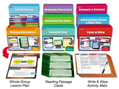 With our super-involving, hands-on kits, students don’t simply practice essential reading comprehension skills—they learn to use text evidence to support their thinking! Perfect for independent, small-group or whole-class use, these versatile kits come with everything students need to focus on a specific skill—from identifying the structure of nonfiction text to analyzing the characters in a story. Each kit includes a whole-group lesson card with sample texts that allow teachers to demonstrate the featured skill, plus 6 sets of materials in each of 4 different activity folders. Kids just follow the 3-step instructions…write their answers directly onto a write & wipe activity mat, citing textual evidence as they go…and check their work against the answers on the back of the folder! Complete set includes all 8 kits shown (write & wipe markers not included). Folders measure 9 1/4" x 11 5/8". Each kit also available separately.