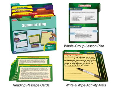 With our super-involving, hands-on kit, students don’t simply practice summarizing—they learn to use text evidence to support their thinking! Perfect for independent, small-group or whole-class use, our versatile kit comes with everything students need, including a whole-group lesson card with sample texts that help teachers explain summarizing, plus 6 sets of materials in each of the 4 different activity folders. Kids just follow the 3-step instructions…write their answers directly onto a write & wipe activity mat, citing textual evidence as they go…and check their work against the answers on the back of the folder! Folders measure 9 1/4" x 11 5/8". Write & wipe markers sold separately.