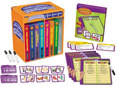 Students master the basics of written and spoken English—with 8 different excitement-filled games! Each game targets a specific skill in grammar, vocabulary or usage…and features a super-simple format that students can easily pick up and play in pairs or small groups—from a memory matching game with idioms and their meanings to a game of “Go Fish” with singular and plural nouns. Each game even includes an answer card for easy self-checking, plus enough materials for up to 4 players at once! You get a set of 8 games, all in an 11 7/8" box.