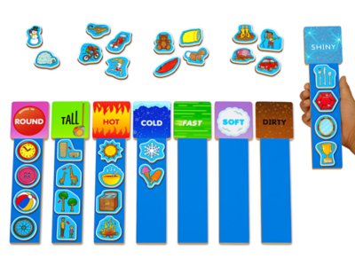 Magnetic rods give kids tons of practice with early language skills! Each durable wooden rod is magnetic—and shows a descriptive word for kids to match. Children simply place magnets right on each rod to match different objects to descriptive words like round, cold and soft! You get 8 rods, 32 magnets and an activity guide. Rods measure 9" long.Additional Information