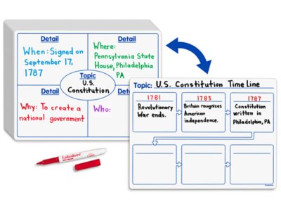 Our handy write & wipe boards are the perfect tool to help students organize their ideas! Featuring a different graphic organizer on each side, the boards can be used for a wide range of purposes—from demonstrating reading comprehension to brainstorming, writing and more. Plus, the boards easily wipe clean, so students can use them over and over! Set includes 30 double-sided boards—enough for the whole class; each board measures 9" x 12". Write & wipe markers sold separately.