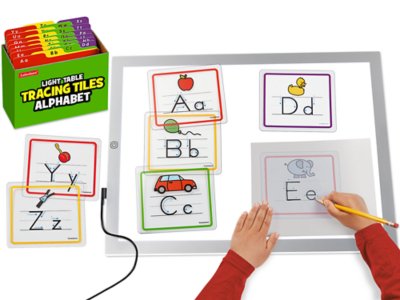 Writing skills shine as kids trace with our colorful tiles! Children simply place a translucent tile onto a light table or panel, lay a piece of paper on top…and start tracing. As students form each upper- and lowercase letter or adorable picture, they practice printing and explore letter sounds! Each set includes 26 tiles, 26 dividers, a storage box and a guide. Tiles measure 4 1⁄2" x 5 1⁄8". Light panel sold separately.