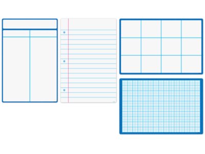 The dry-erase surface on these reusable sheets makes them great for staying on track, making lists, posting announcements, graphing progress and so much more! Set includes 4 write & wipe sheets—a 12-space grid, a two-column chart, notebook paper and graph paper. Each sturdy and durable page measures 10 3/4" x 16 1/8".