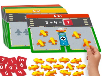 Send addition skills soaring with our hands-on math center! The transportation-themed center includes activity cards at 3 levels of difficulty—starting with the equation solved with supporting illustrations…progressing to problems with the answers missing but still with visual guidance…and culminating with independent, unguided problem solving. Kids use the airplanes and number tiles to complete the activity cards, gaining confidence as they progress from level to level—the perfect way to get the targeted practice they need! Activity center includes 30 cards, 50 plastic airplanes, 40 number tiles and a guide. Cards measure 8 1/2" x 11".Additional Information
