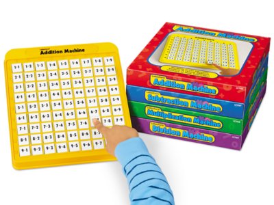 Our fun-to-use machines make math so simple, kids can teach themselves! Children just press the equation buttons—and up pop the answers. This hands-on approach to basic math operations helps reinforce addition, subtraction, multiplication and division facts through self-checking practice. You get 81 equation buttons locked securely into each tough 8 1/2" x 9 1/2" plastic frame. Complete set includes all 4 math machines shown. Individual math machines also available separately.