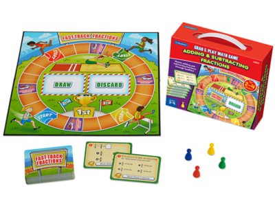 Students get engaging math practice as they add and subtract fractions with like denominators! Kids draw game cards and solve problems—and if they answer correctly, they move forward on the game board. The first player to make it back to their start space wins! Our ready-to-play game is easy to set up and includes a game board, 50 game cards featuring three levels of difficulty, 4 pawns and an answer card. For 2-4 players. Game board measures 12" x 12".