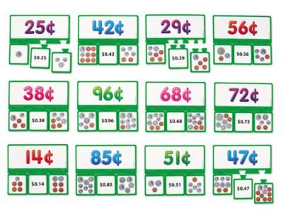 As children fit together our equivalency puzzles, they practice identifying money values…in 4 different ways! Each self-correcting puzzle has 4 simple pieces—kids just choose a large puzzle piece showing an amount in cents…then connect 3 corresponding pieces that express the same value using a dollar sign and two different coin combinations! You get 12 puzzles and an activity guide. Puzzles measure 5" x 6".