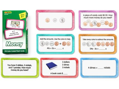 Money concepts are easy to master—with these self-checking flash cards! Ideal for skills review, extra reinforcement and standardized test preparation, the pack includes 167 color-coded flash cards covering coin identification and equivalencies, currency from $1 to $20 and coin combination problems—all with answers on back, so it’s a breeze for students to check their work. Cards measure 3" x 5 3/4" and come in a handy storage box.