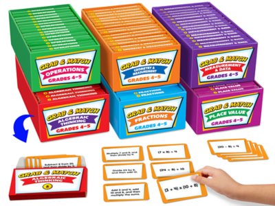 Our card games boost critical thinking, speed and accuracy—to help math become second nature! Each box includes 15 games that progress in difficulty and cover everything from word problems to area and perimeter. You get all 6 boxes shown; each has 240 cards, plus an answer key. Boxes measure 10 1/2" in length. Each box of 15 games also available separately.