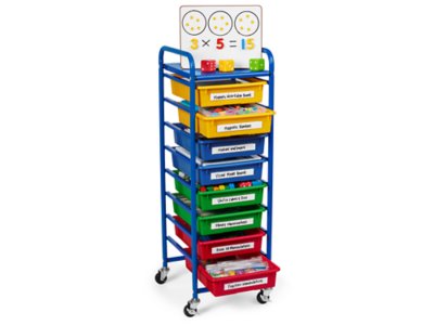 Our compact, mobile cart includes a variety of materials to help support and boost math skills! The cart is perfect for small-group lessons, targeted intervention, one-on-one tutoring and more…and includes enough materials for up to six students at a time. Simply select any of the hands-on manipulatives and use them to support or enhance your curriculum. Or choose an activity from one of the activity cards, gather the materials and follow the step-by-step instructions! The 8-Tray Mobile Organizer measures 12 3/4"w x 14 5/8"d x 38 1/4"h.