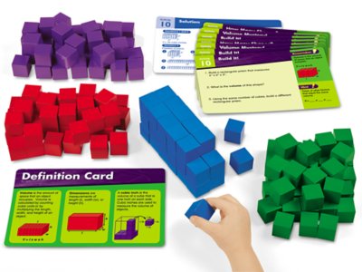 Kids find the volume of rectangular prisms and rectilinear figures—with durable manipulatives that provide tons of hands-on experience! Our kit comes with 160 wooden cubes—plus 20 kid-friendly activity cards. Simply set the kit in your math center and let kids select an activity card…then watch as they uncover volume concepts by building and deconstructing 3-D shapes. Best of all, kids just flip the cards over to check their own answers! Cubes measure 1".