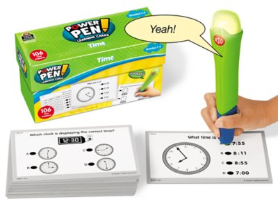 Here’s a super-fun way to build time-telling skills—with instant reinforcement! Kids just touch an answer with the special pen…and the pen tells them if they’re right or wrong. You get 53 double-sided cards and an answer key. Box measures 3 3/4" x 6 1/2". Power Pen sold separately.