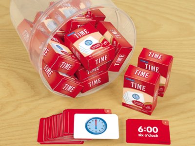 There are so many ways to play with our fun-filled math cards—and master time-telling skills along the way! Students just grab a deck to use as traditional flash cards…or follow simple directions to play skill-building card games—from time slapjack to go fish! The tub includes 18 decks of cards and a guide featuring several card games. Cards measure 1 3/4" x 2 1/2".