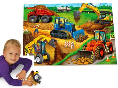 Children create an action-packed construction site as they put together this giant floor puzzle! From an excavator and a dump truck to a bulldozer and a front loader, the puzzle highlights a variety of hardworking vehicles, encouraging children to identify and observe each one. The sturdy, 48-piece puzzle features bright, inviting details kids will love to complete, building fine motor control, concentration and problem-solving skills along the way. The self-correcting puzzle measures 2' x 3'.