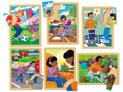 A girl in a wheelchair playing baseball, a boy with leg braces planting a garden and more…our beautifully illustrated puzzles show that kids of all abilities have a lot in common! Each sturdy hardwood puzzle features just 9-10 chunky pieces that are raised for easy handling…plus rounded corners for safety. Set includes the 6 puzzles shown; each measures 9" x 12".