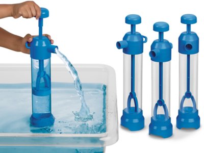 These clear-view pumps are a great way for young learners to observe cause and effect as they experiment with water! Children simply submerge the base…pump the chunky knob up and down to fill the chamber and build pressure…then watch the water flow! Set includes 4 durable plastic pumps; each measures 13".