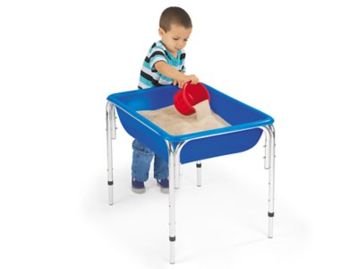Our lightweight, portable table sets up anywhere—indoors or out—for instant sand & water play! The big plastic tub provides lots of room for digging and scooping…yet it’s a breeze to lift out of the sturdy aluminum stand for emptying and cleaning. And it’s so easy to adjust the height of the stand: The simple push-button design lets you change the height in a flash. Easy assembly.