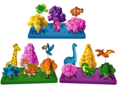 Adorable creatures “play” in vibrant crystal scenes that kids grow themselves—a wonderful way to explore science and learn about chemical reactions! This complete, kid-friendly set includes all 3 kits shown, each with everything children need to create an amazing world of crystals that fully bloom in 48 hours—cute animals, crystal-growing solution and more. Sturdy plastic bases measure 5 1/2" x 9 1/2". Each kit also available separately.