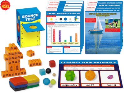 Designed to support specific learning objectives of the Next Generation Science Standards* for second grade, this hands-on kit targets essential standards—from describing and classifying matter to assessing material properties! The kit includes 4 double-sided, 8 1/2" x 11" Investigation cards that help students make inquiries and design investigations, 4 Connection cards that help relate findings to the real world, a bounce test tower, a classification card, 10 classifying materials, 16 building blocks and 6 bars of oven-bake clay. Plus, you get a detailed guide featuring full lesson plans, possible outcomes and more!