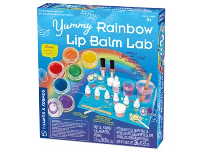 Mix up a rainbow of mouth-wateringly delicious lip balms and glosses with this fruity beauty lab! Kids will experiment with a vibrant spectrum of colors and flavors to create their own personalized lip products. The kit comes with all the tools needed to create 6 yummy lip balms in strawberry, grape and banana flavors—even stickers to decorate the creations! Plus, children can explore the science of skin while learning simple lab techniques with the 10 experiments in the full-color, 16-page manual. Includes 26 pieces—a plastic tray, 3 dyes, 3 flavors, base oil, wax, soy ester, 2 spoons, 3 spatulas, 6 jars with lids, 2 bottles with roll-on applicators, 2 plastic measuring cups and a sticker sheet—plus a guide; tray measures 7 1/4" x 10". Packaging may vary.