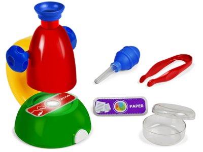 This kid-friendly microscope gives budding scientists an up-close look at the world! The 30X microscope is made just for beginners, with a rugged plastic design, easy-turning knobs and fun tools for kids to explore, including tweezers, a petri dish, an eyedropper and prepared slides. Microscope measures 8 1/2" tall. Requires 2 “AAA” batteries (not included).
