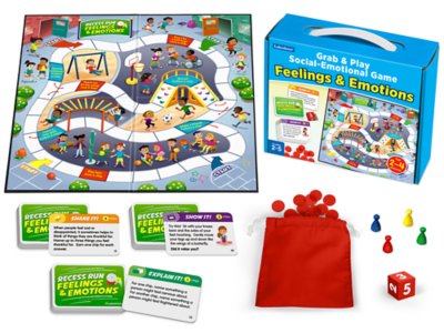 Our fun-to-play game helps students learn from one another as they discuss their feelings and emotions! As players move along the recess-themed game board, they draw cards that invite them to share, explain and show how they’d handle everyday situations—collecting chips as they go. The first player to collect 20 chips wins! You get everything needed to play, including a game board, 60 game cards, 80 plastic chips, a drawstring bag, 4 pawns, a die and an activity guide. Game board measures 12" x 12". For 2-4 players.