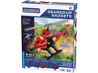 Kids learn about gears, transmissions, force and motion as they build 5 fun gadgets and make them work! The kit guides kids through the building process and experiments, helping them create a helicopter model, a spinner toy and more. Kit includes 114 building pieces and a full-color 24-page manual with illustrated step-by-step instructions. Largest piece measures 5 3/4" in length.